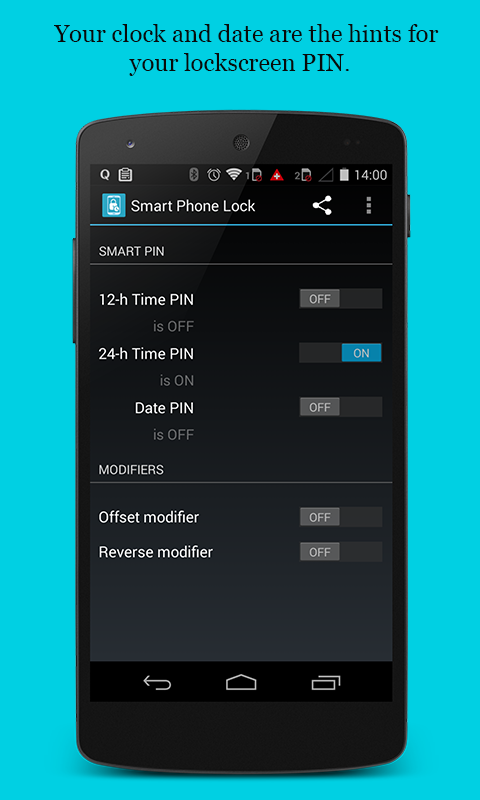 Smart Phone Lock will set the current phone time as your unlock PIN for the lock screen. It will change the PIN magically on every minute! So, each time you unlock the device, the PIN will vary and you need not worry about prying eyes around you. The best part is, you need not memorise anything to remember the PIN. The modifiers will allow you to enhance the security to the next level.